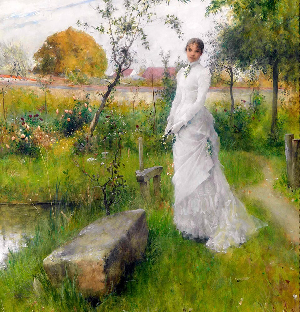 Karin Larsson i brudklänning, målad av Carl Larsson i Grez-sur-Loing.Rebecka i brudklänning i Grez-sur-Loing 2024, fotograferad av Dick Gillberg.