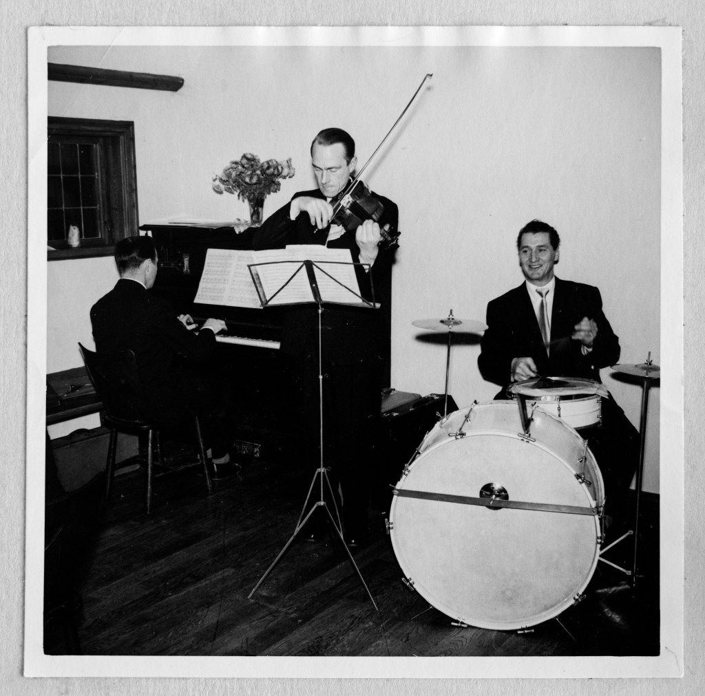 Zetterbergs Trio: Arvid Johansson på piano, Sune Stenström på fiol och Karl Zetterberg – med ett leende på läpparna – på trummor. Bild: Ur Per-Olof Zetterbergs samling