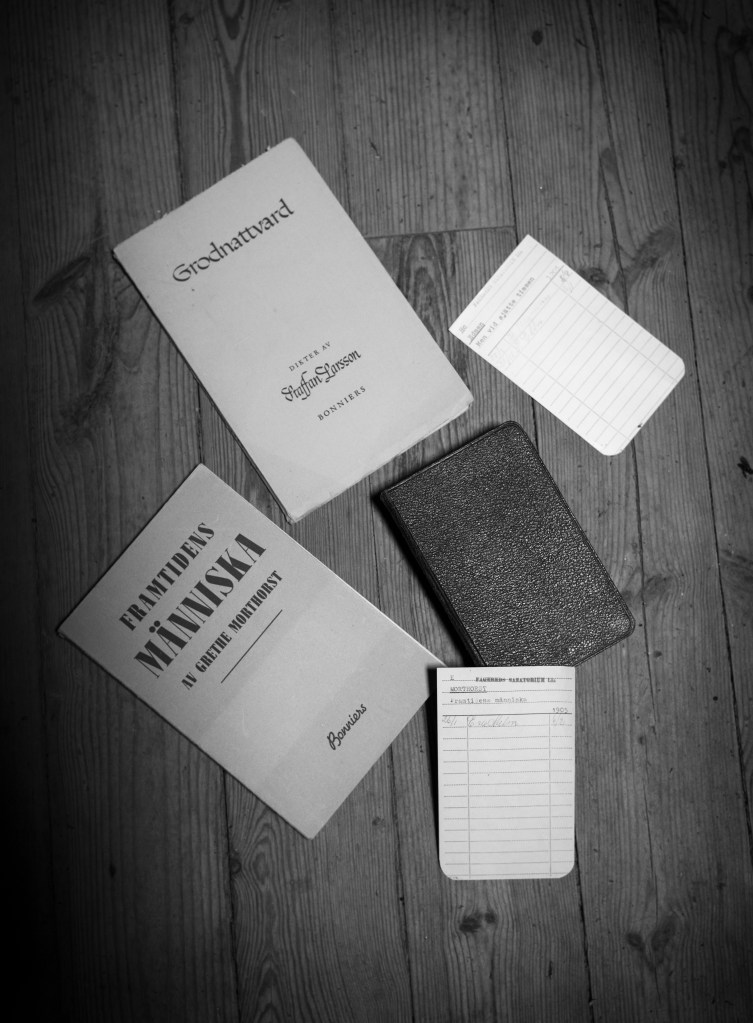 Finns Giftas med? Kallocain? Det går an? Nej, det ska sägas att vi just den sommardagen inte hade Kulturkanon i tankarna – även om den när detta skrivs är rasande aktuell. Där och då blev vi mest fascinerade att över huvud taget hitta någonting från sanatorietiden på vinden.