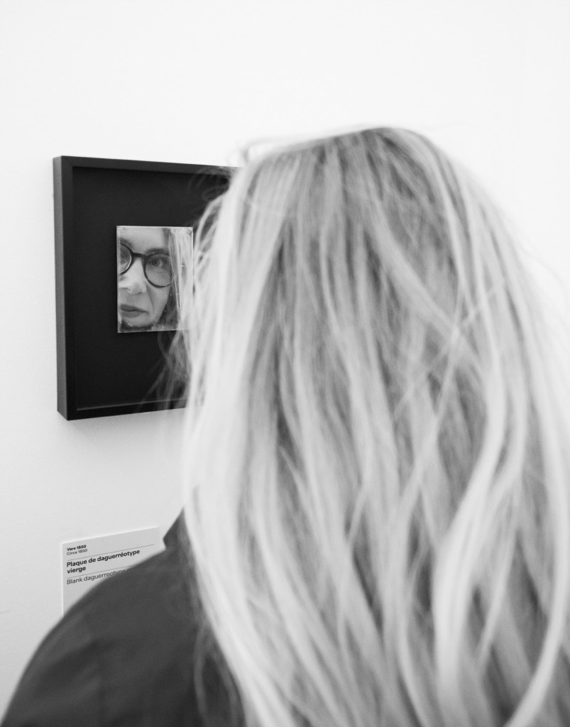 En blank daguerreotyp från utställningen med fotografierna från de anonyma fotograferna. Den ena resenären fångad i reflektionen. Bild: Dick Gillberg