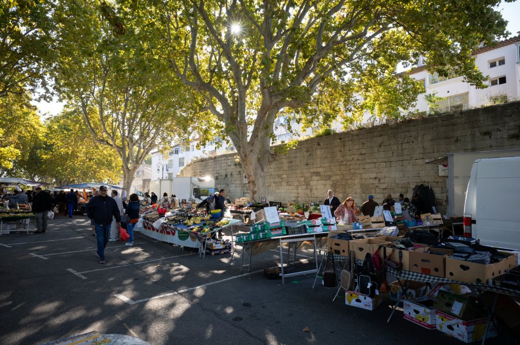 Marknad vid stadsmuren i Arles. Grönsaker, bröd, kött, fisk, hantverk och loppisprylar samsas på platsen. Marknaden är på plats varje onsdagsförmiddag. Bild: Dick Gillberg