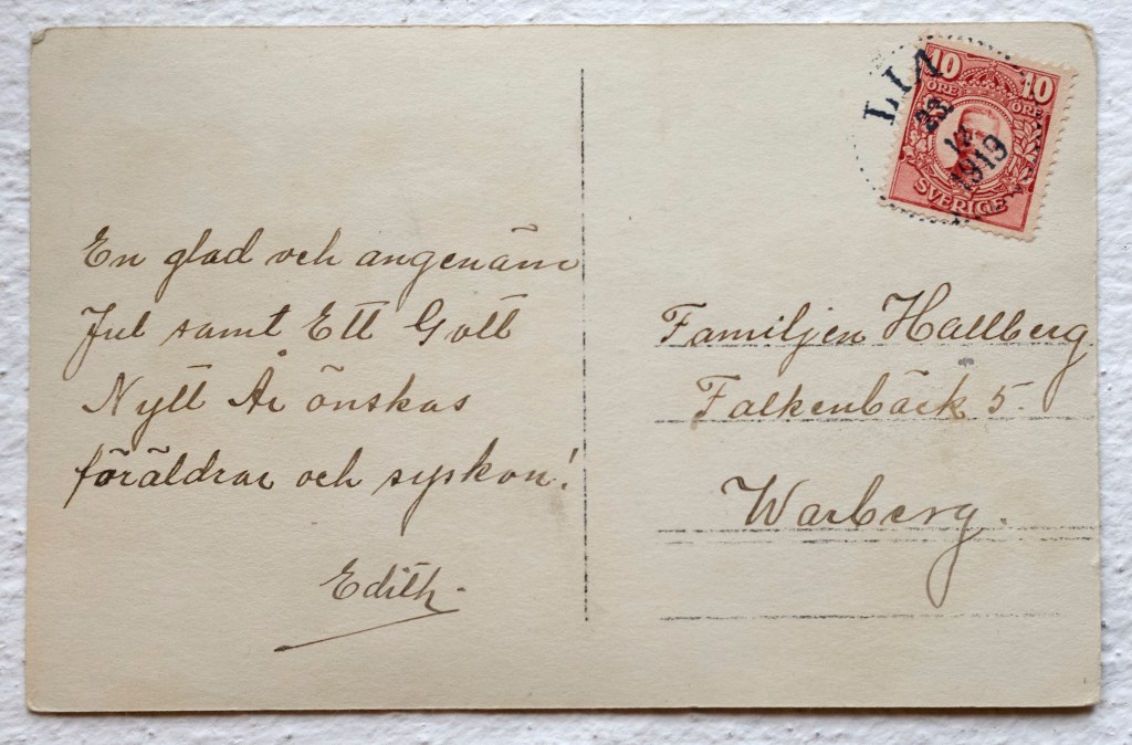 Här och nu är det vi som skickar denna julhälsning, men egentligen är kortet sänt från Varbergsflickan Edith – en av sanatoriets första patienter. Kortet är poststämplat 1919. (Sanatoriet öppnade 1914.) ”En glad och angenäm Jul samt Ett Gott Nytt År önskas” från Edith, och vi stämmer in i hennes hälsning.